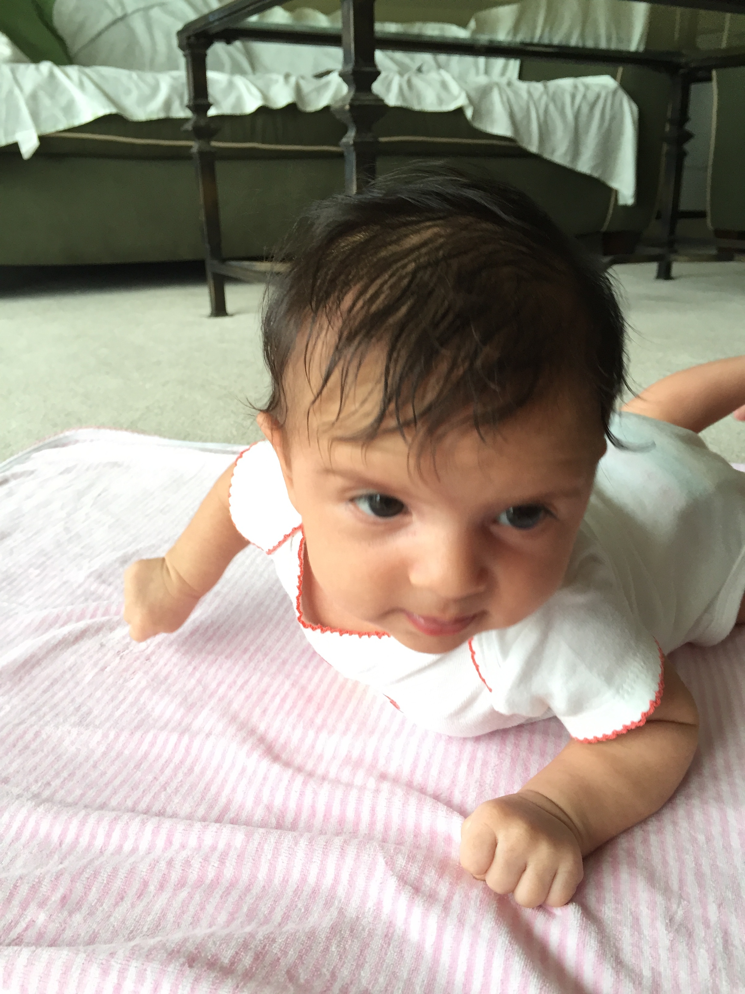 She rolled on her own for the first time two weeks ago. She squiggled from her front onto her back in a very deliberate way. I caught it on a short video! Unfortunately, I was so excited that only two seconds of the three second event made it onto youtube for our families to celebrate her achievement. Afterwards, I wasn’t sure how to feel. She’s only a few steps away from rolling from her back to her front which is only a few steps away from crawling. A mobile delicate Dahlia makes us very, very nervous. I’m sure I will feel this way about every step in her development.